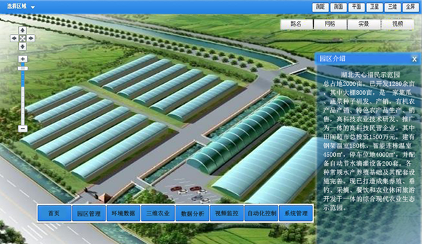 本系統采用了虛擬紋理、分塊調度等關(guān)鍵技術(shù),解決了海量三維數據的建庫、管理、調度與發(fā)布問(wèn)題,使得三維虛擬現實(shí)系統由單一的應用系統向系統集成方向發(fā)展成為可能。它能生動(dòng)地從宏觀(guān)上展示農業(yè)園區的整體風(fēng)貌,從微觀(guān)上描繪出大棚內各個(gè)設備的運行情況及數據參數,使用戶(hù)直觀(guān)、生動(dòng)并且快速的獲取到所需要的信息,將三維技術(shù)與農業(yè)信息化相結合,是蒼穹公司在現代農業(yè)領(lǐng)域的又一大創(chuàng )新。